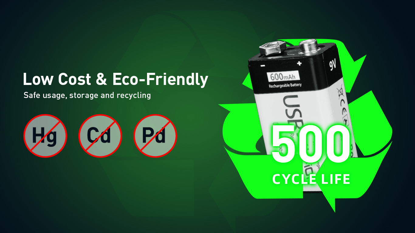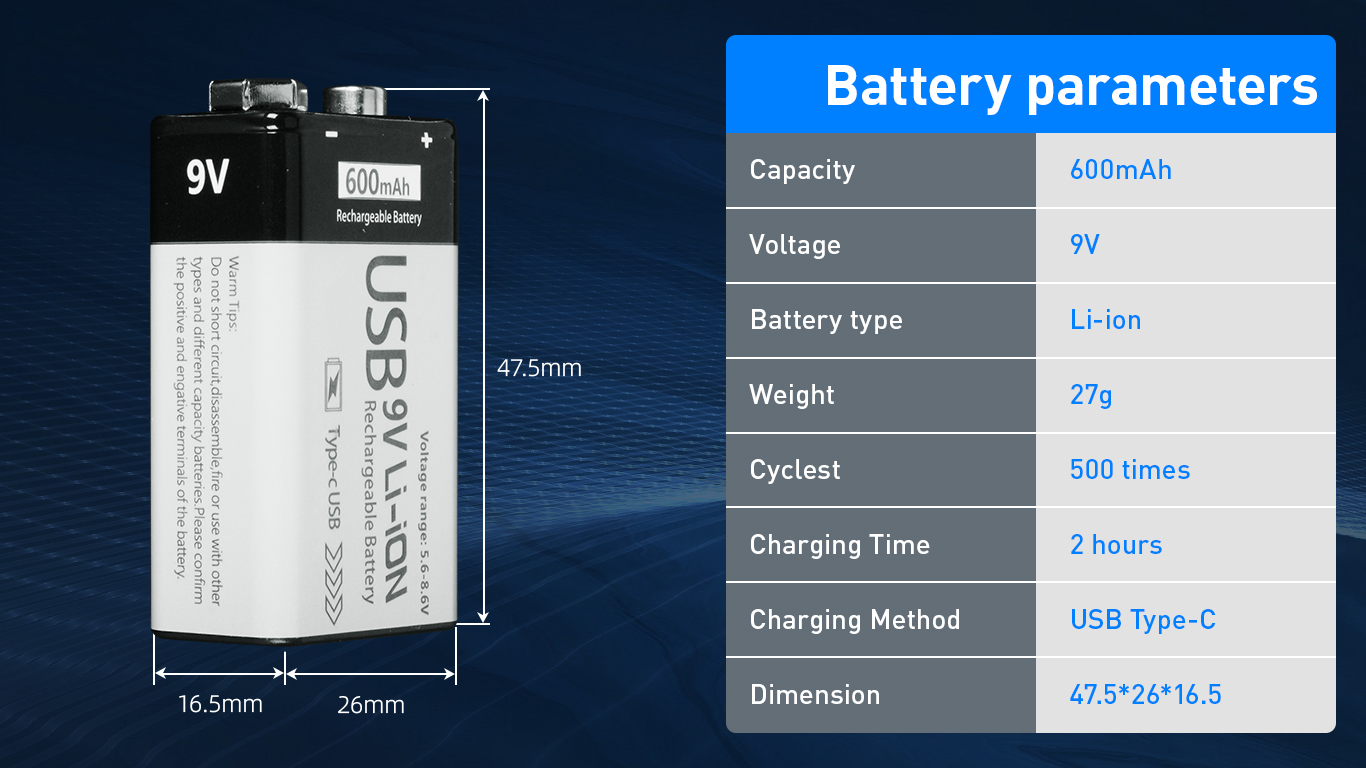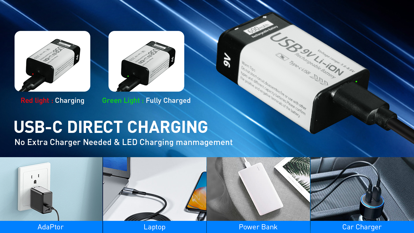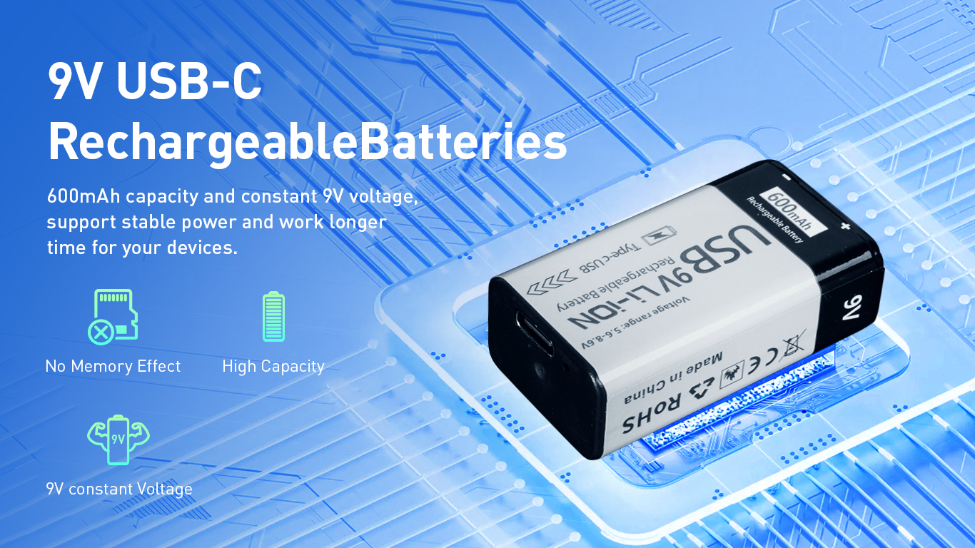 9V 600mAh Li-ion batteries with USB-C rechargeable(2-pack, 4-pack, 8-pack)