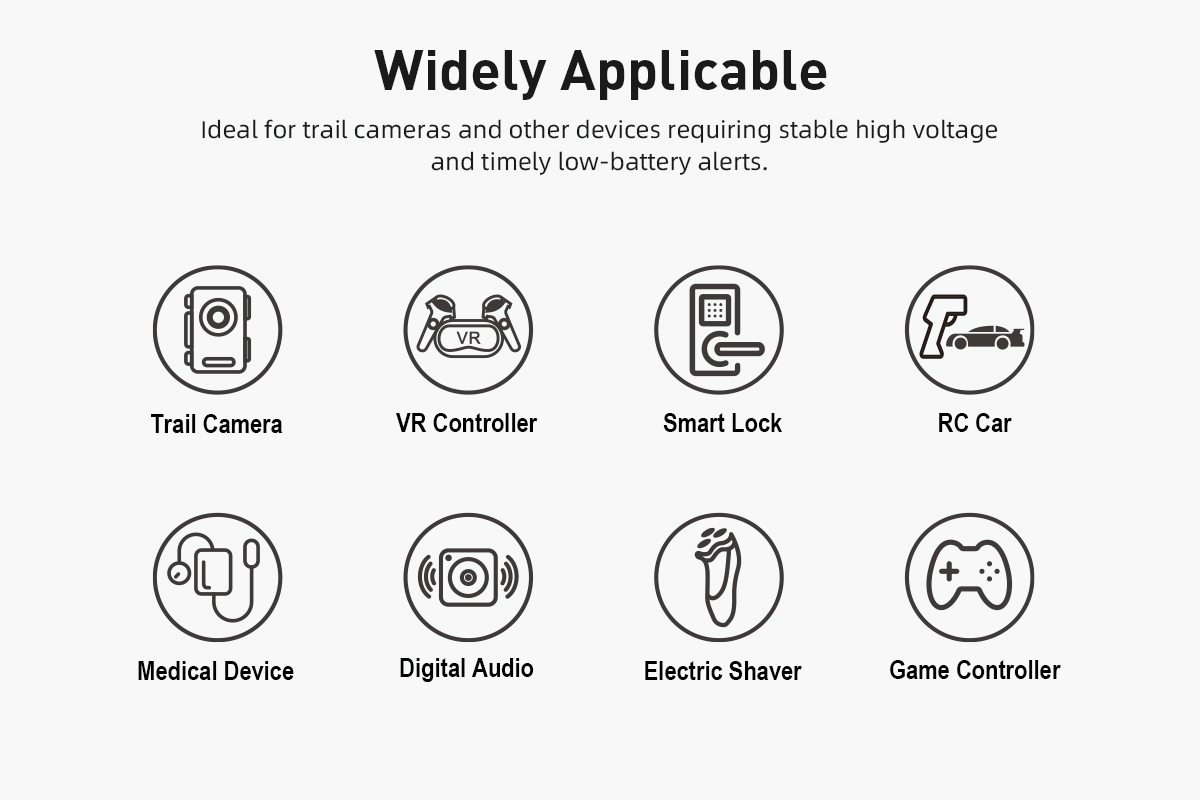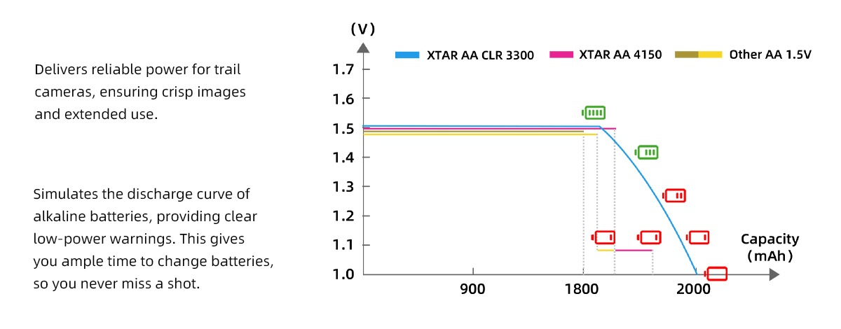Provides constant voltage for stable performance and mimics the gradual power decline of alkaline batteries, including a clear low-battery warning.