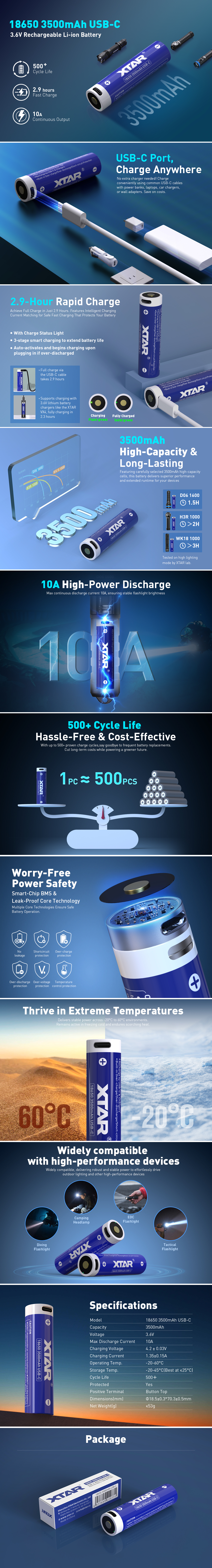XTAR 3.6V 18650 3500mAh USB-C 10A Li-ion Rechargeable Li-ion Battery