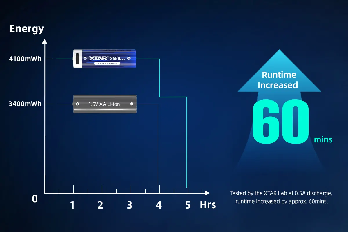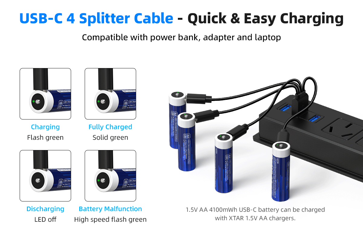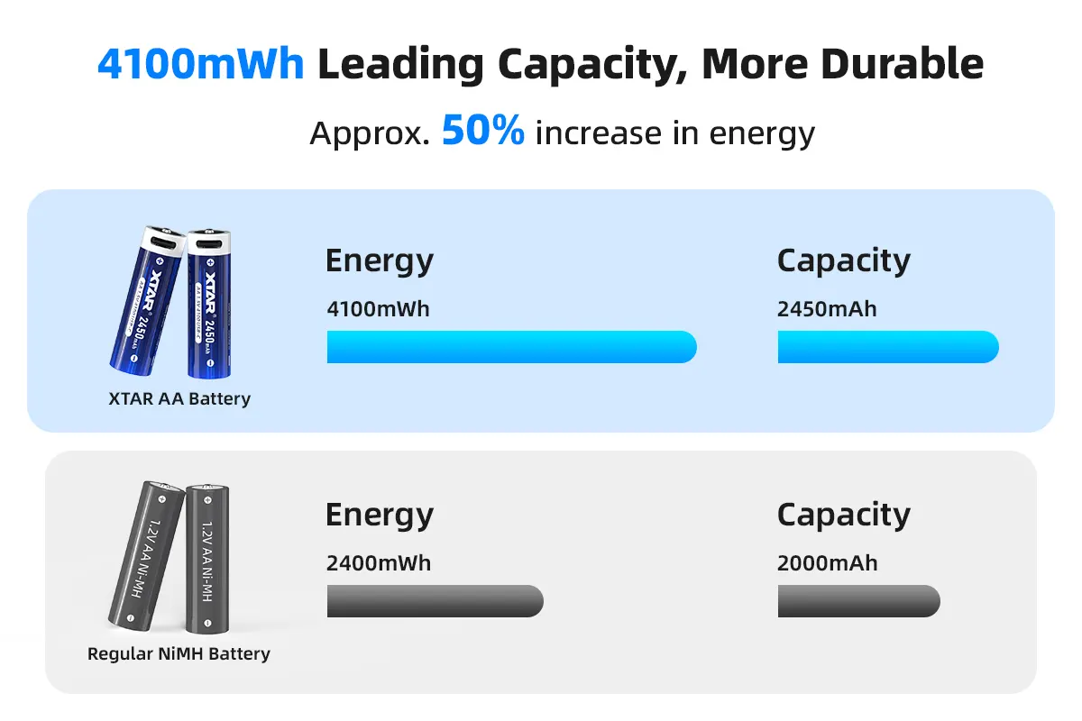 XTAR AA 1.5V USB-C Rechargeable Lithium Battery 4100mWh/2450mAh with Low Voltage Indicator