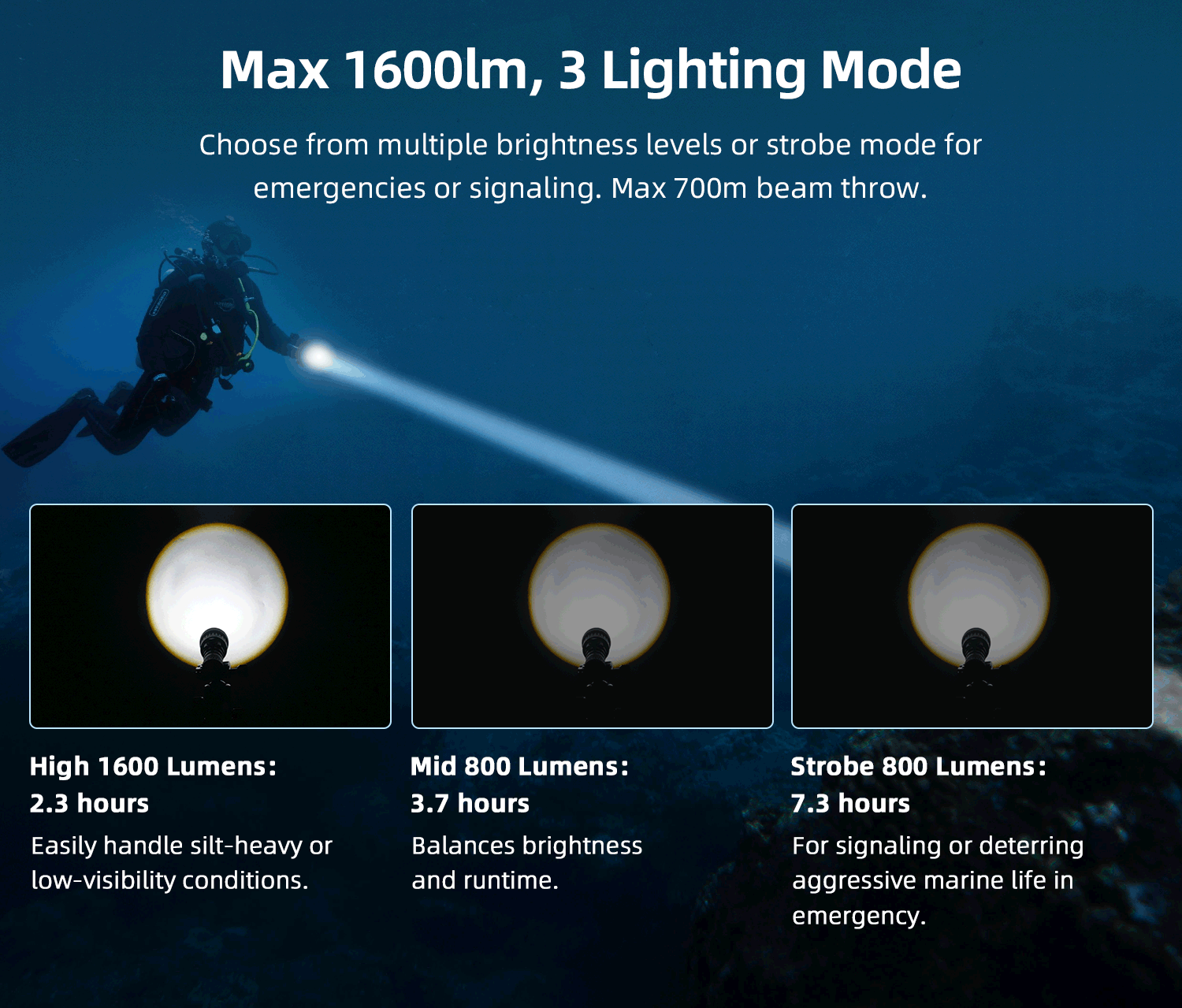 Ideal for lobster hunting, cave diving, night dives, and underwater filming.