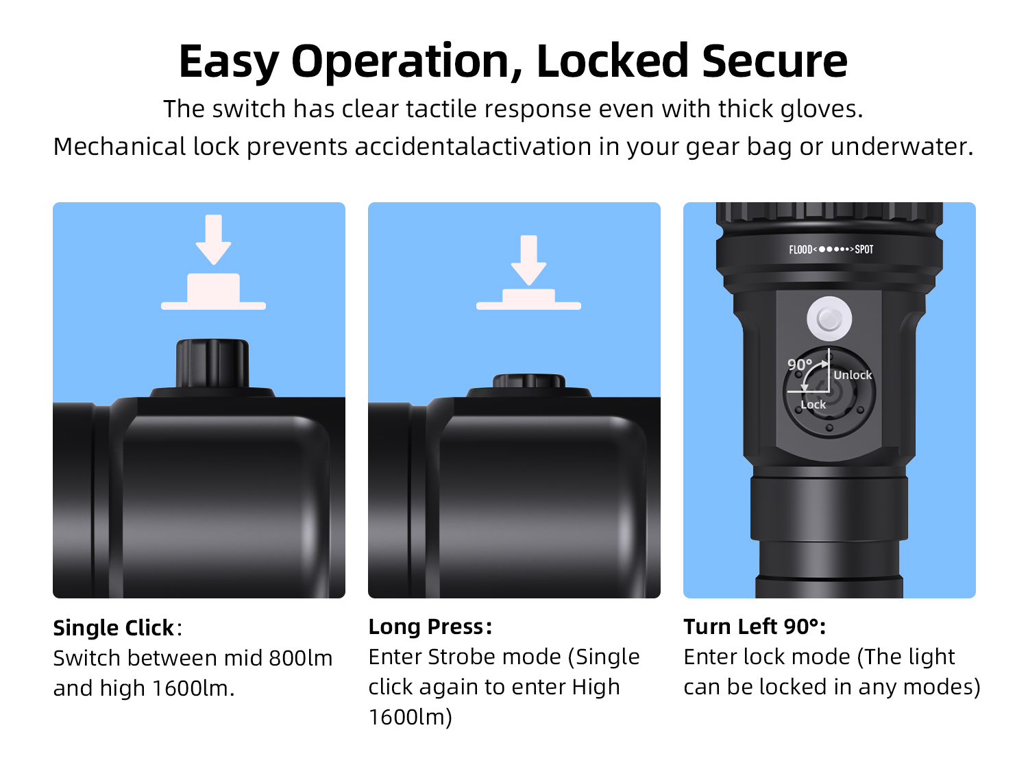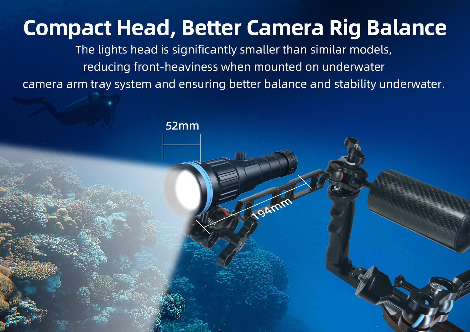 Combines high output, extended runtime, and intuitive controls – optimized for recreational/technical divers and underwater photographers.