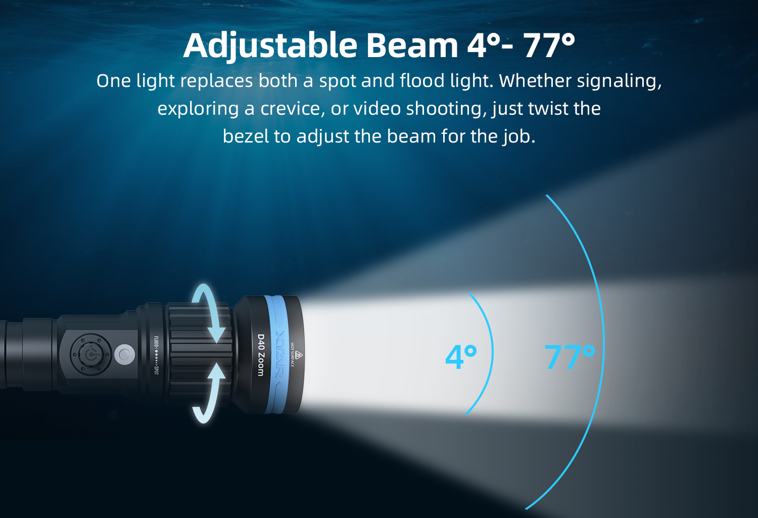 Seamlessly zooms from ultra-focused 4° spot to ultra-wide 77° flood beam.