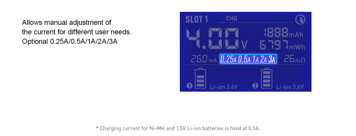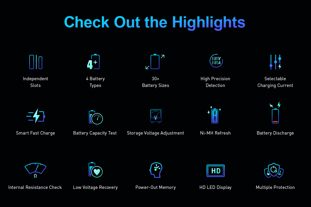 Q1: Can the charger charge and discharge simultaneously, and can different current settings be applied to different battery slots? A: Yes, the channels operate completely independently. You can set different charging currents for each slot based on the battery capacity, or assign different functions to each slot — for example, capacity testing in one slot and reconditioning in the other.