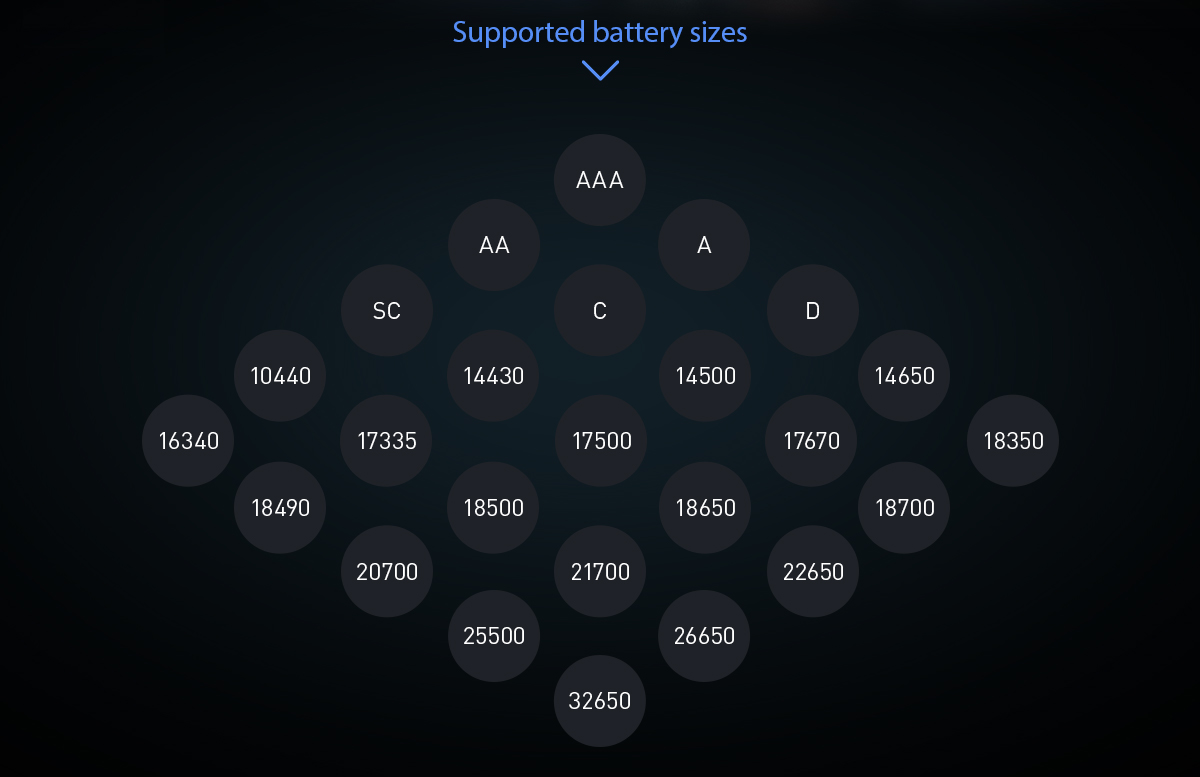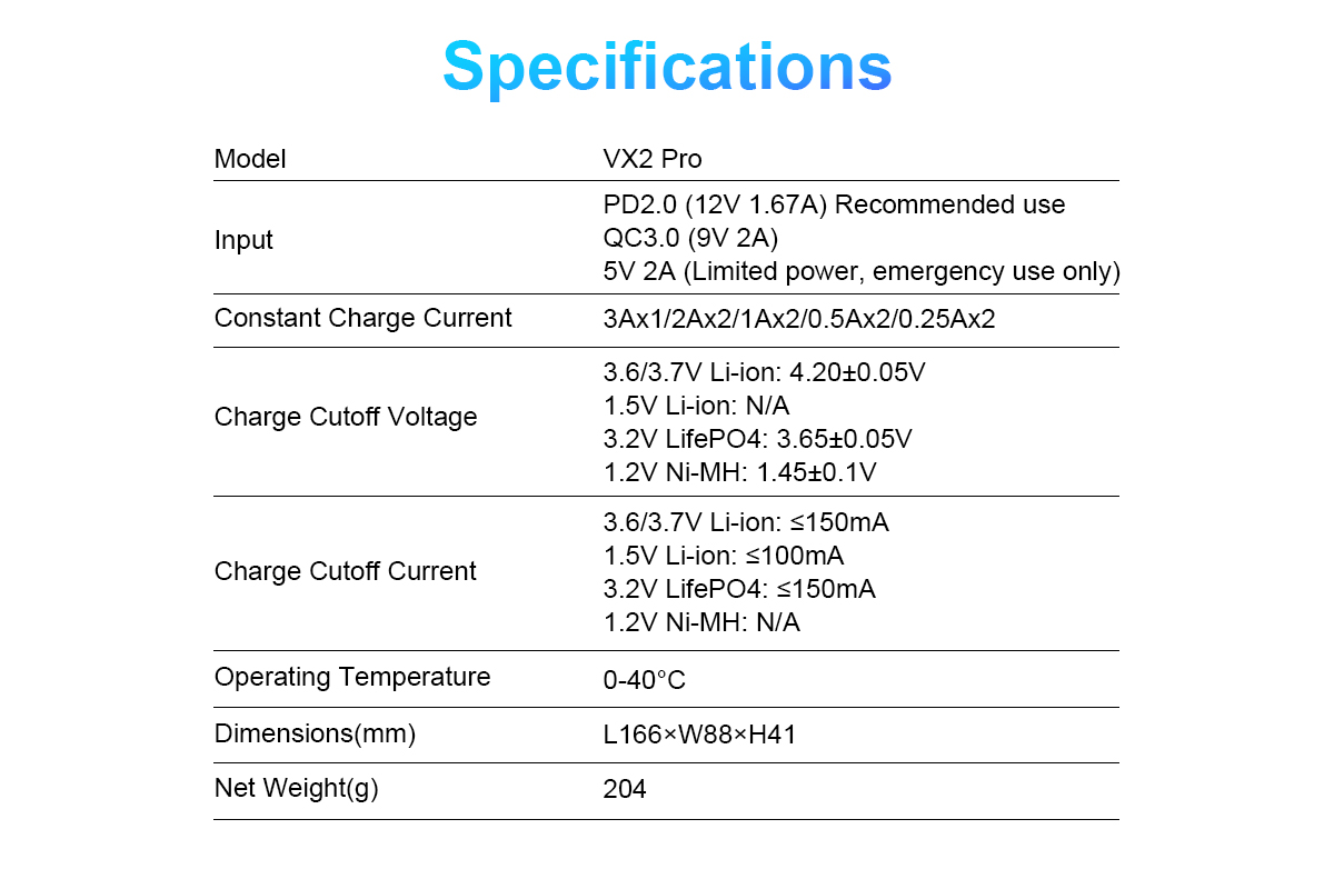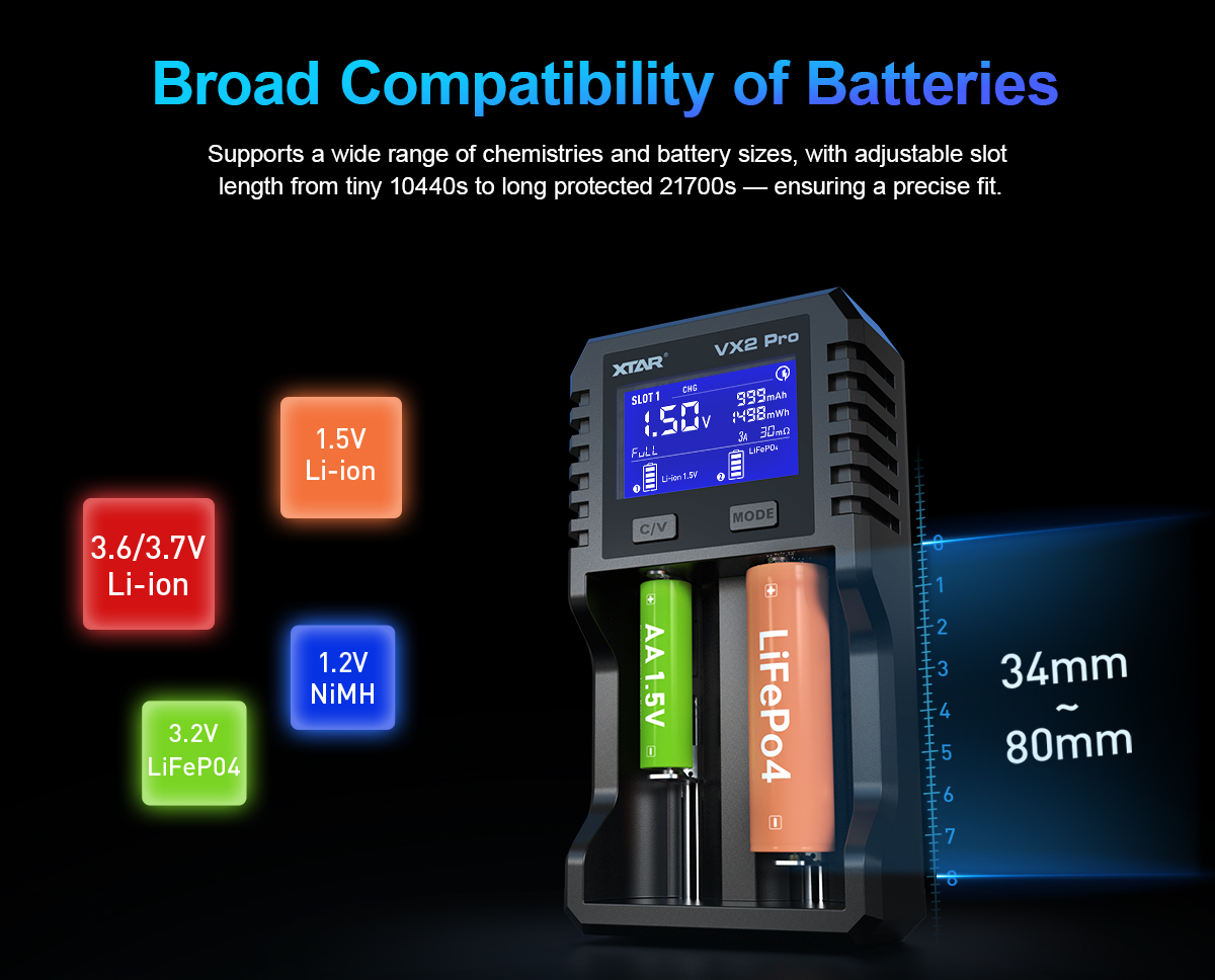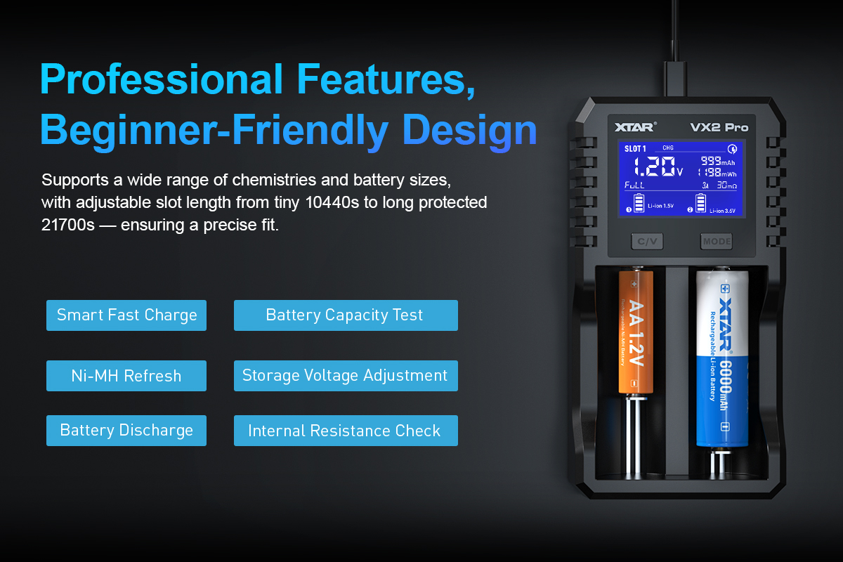 The VX2 Pro is a dual-slot smart charger with independent control Compatible with 10400-32650 3.6/3.7V Li-ion, AA/AAA 1.5V Li-ion, AA/AAA 1.2V Ni-MH, and 3.2V LiFePO₄ batteries. It supports PD, QC, and 5V input via Type-C, and offers charging, discharging, refreshing, capacity grading, and storage—delivering pro-level performance at an accessible price.