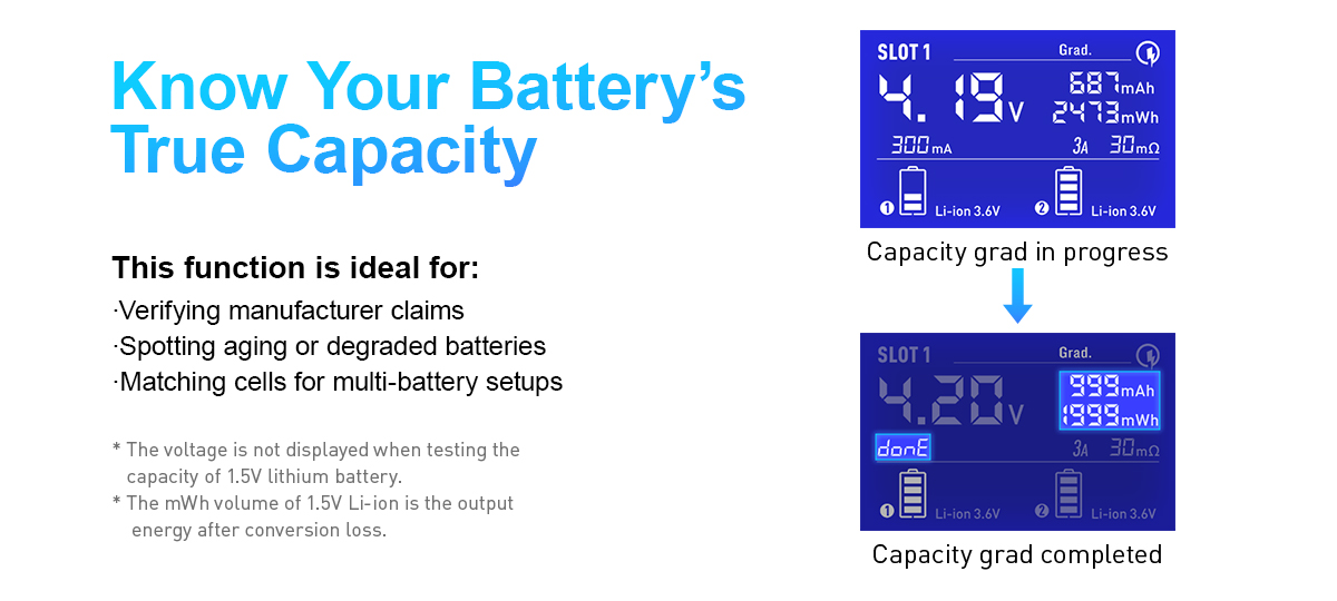 Storage Mode: Charges or discharges the battery to a storage voltage (applies to 3.6V/3.2V/1.2V batteries). The closer the battery is to the storage voltage, the less time it takes. For 1.5V Li-ion batteries, the process includes discharge-charge-discharge and takes over 10 hours.