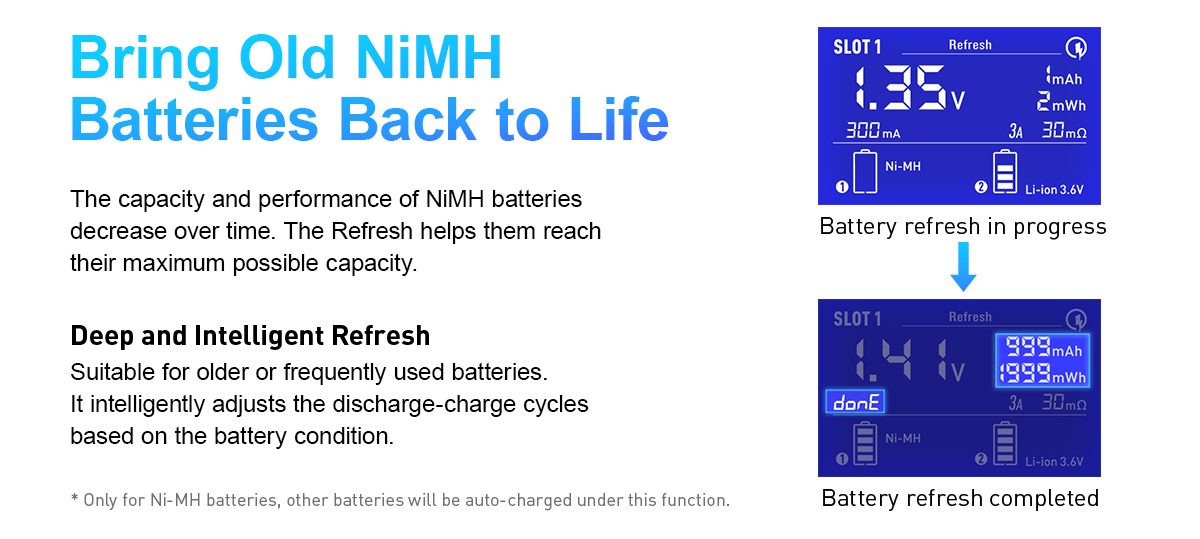Reconditioning Mode: Involves discharge-charge cycles (up to 4 times, depending on battery condition). Older or weaker batteries may require more time.